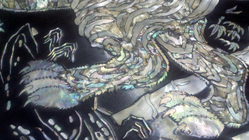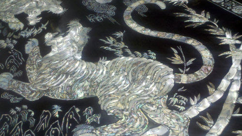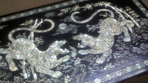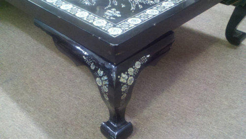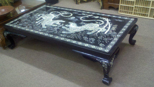 Oriental TableBlack Lacquer Asian Coffee TableTigers done in Abalone ShellsTable looks to be Chinese StyleMother of Pearl Tigers and DecorTable is Gorgeous!It is in very good condition and would make a fine find for your Asian decor room. There are some very minor imperfections on some edges of this table. Some can be seen in the close image of the leg.APPROX. TABLE SIZE:33-1/2” x 60” x 15” HighPrice is $1100.00NM residents %7.375 taxShipping, Packing and Handling Charges:$65 Plus Actual Shipping and Insurance Charges to your destination. Of course this item can be picked up from our store with no additional shipping charges.Paypal button is for Item cost only.If shipping is desired then an additional invoice will be emailed for the actual shipping costs. This must be paid via Paypal before we will ship the item to you. For QUESTIONS or to make an OFFEREmail us at Sales@SilverCityTrading.com